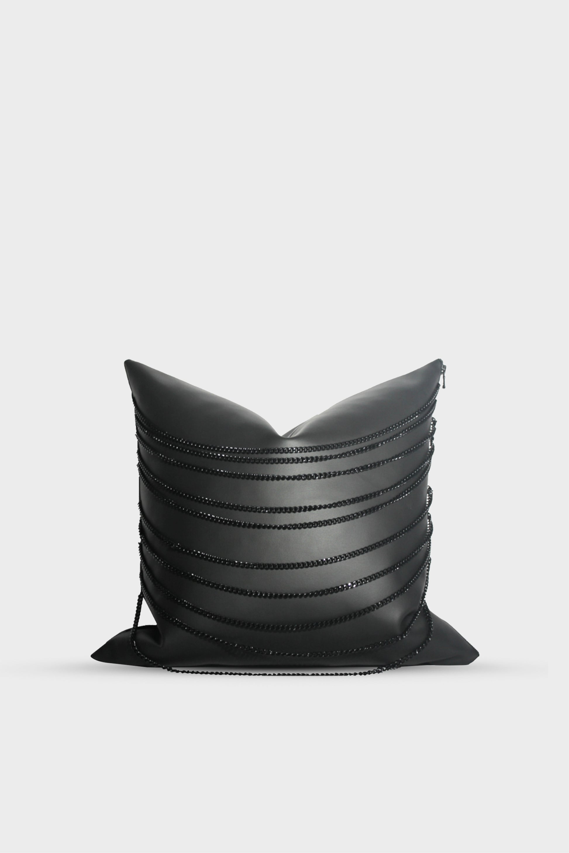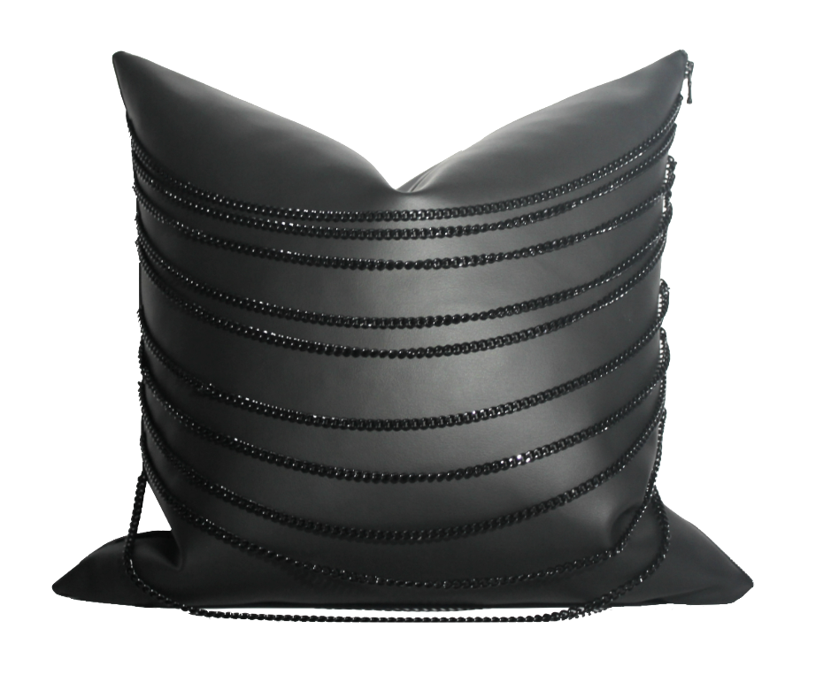 A visually impactful silhouette featuring swooping curves and sleek lines that effortlessly straddles the line between furniture and sculpture. Weighted chains merged with the softness of faux leather creates this beautiful juxtaposition between hard and soft.