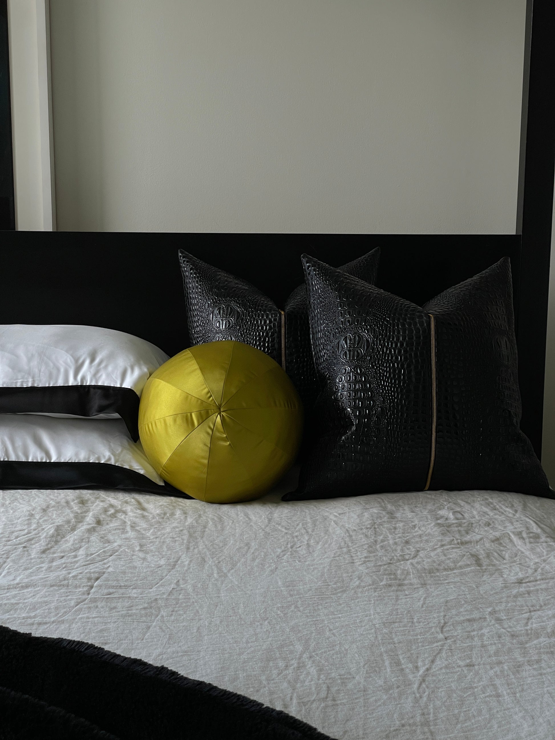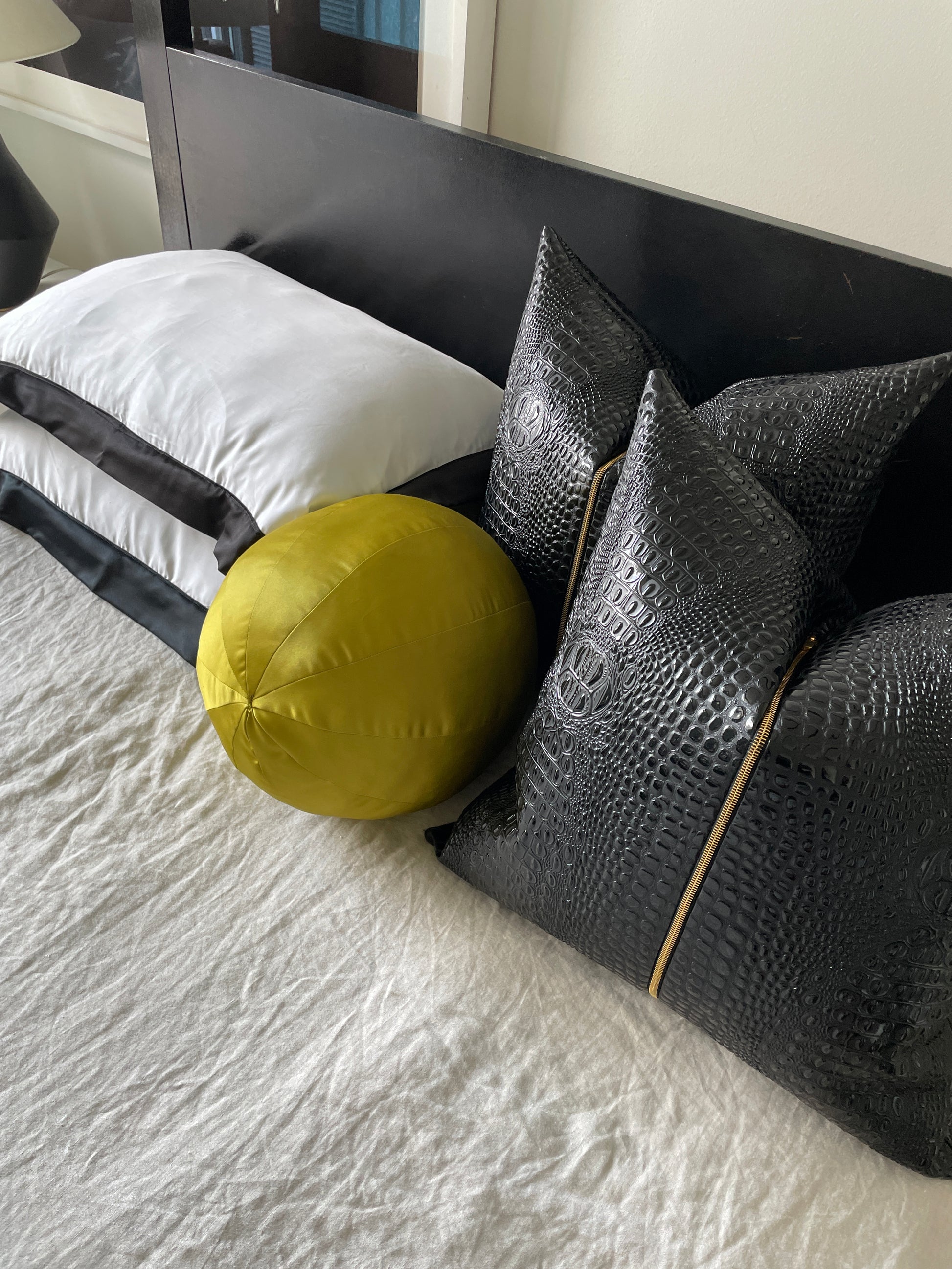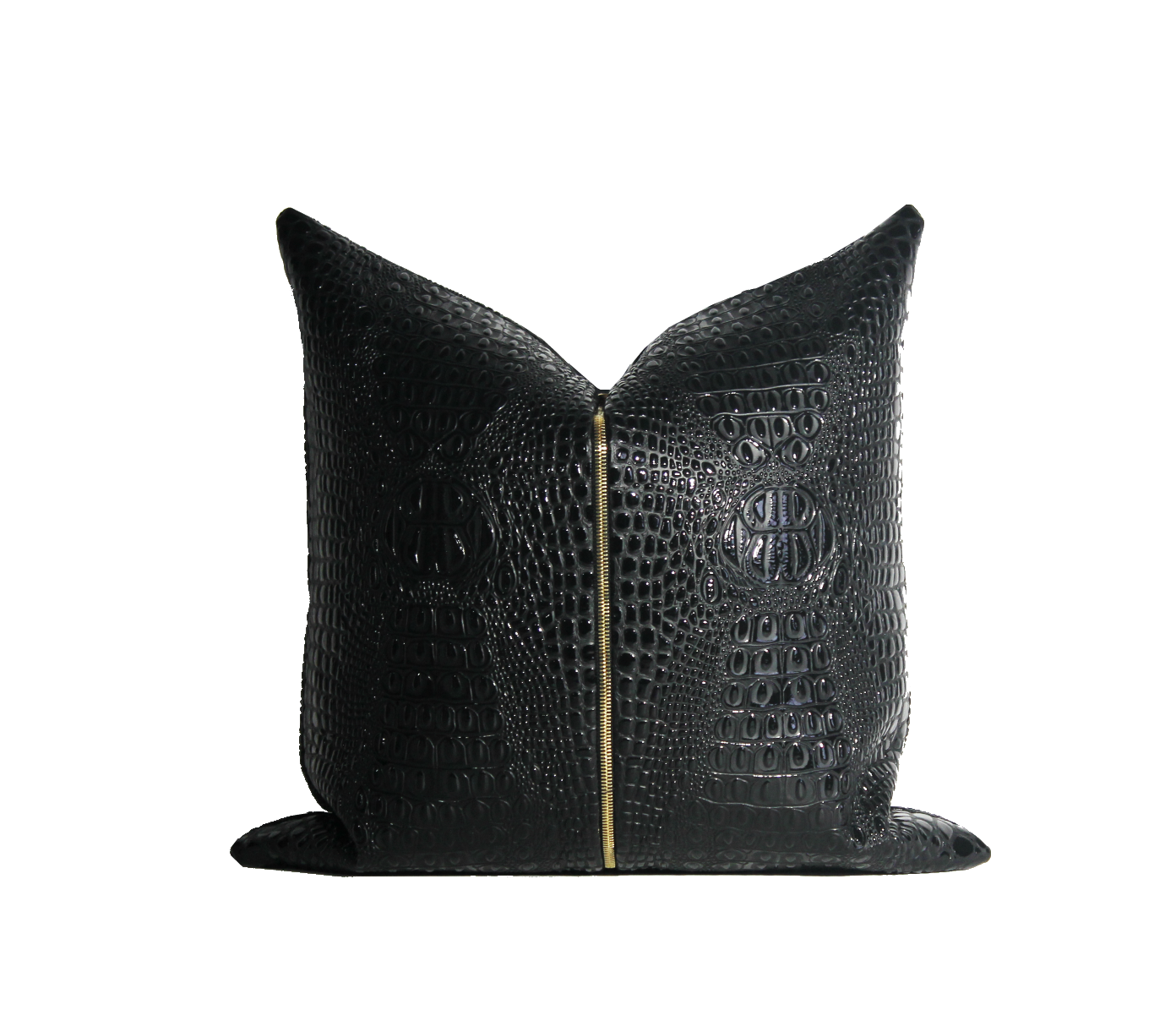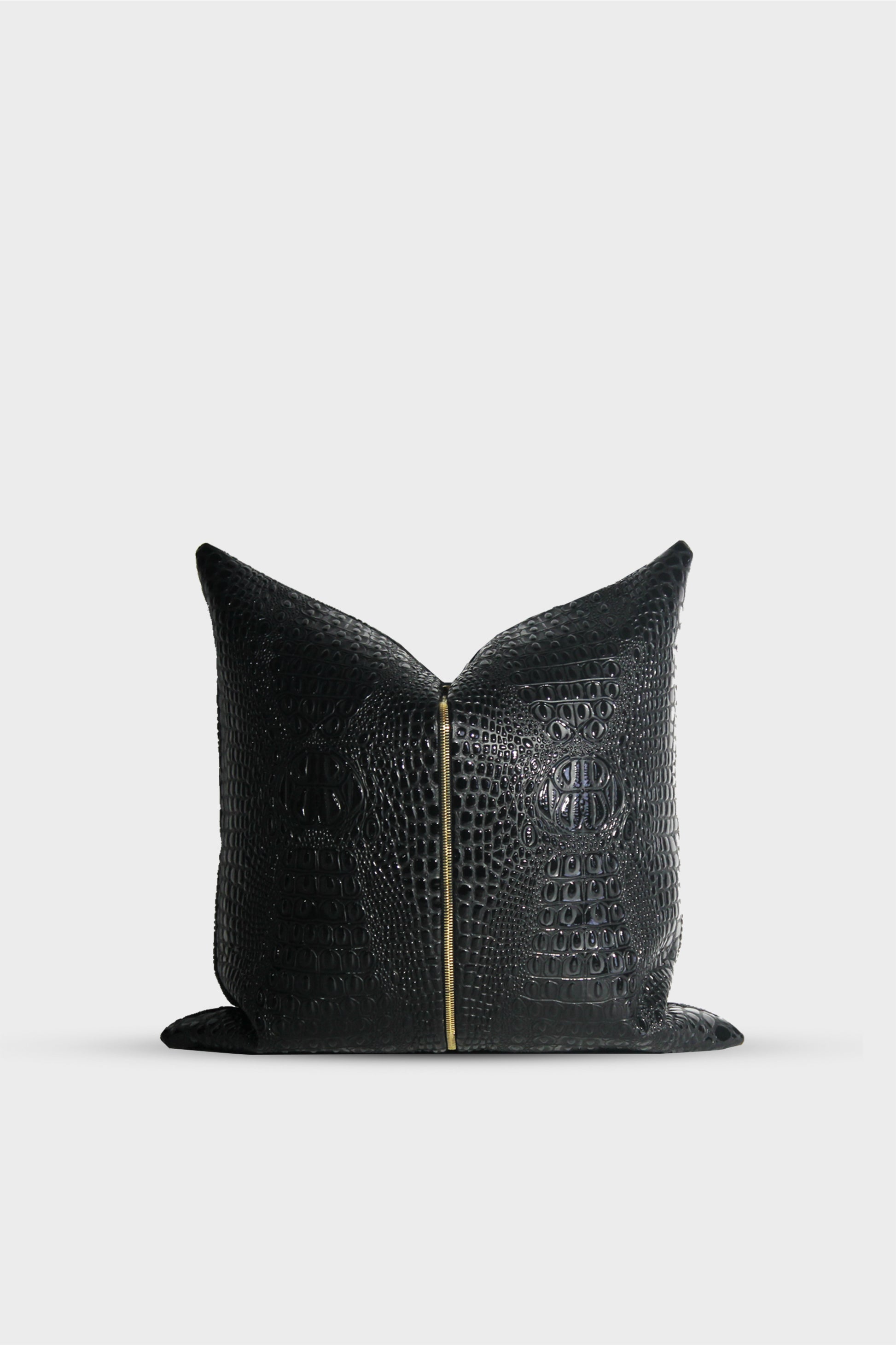 As our best selling pillow, Noir is an iconic convergence of modern design and feminine wilds. Her love language is a martini and a sharp tongue. Sleek crocodile embossed fabric merged with a rich gold toned central zipper, creates a textural dynamic that exceeds pure symmetry and makes this pillow a work of art.